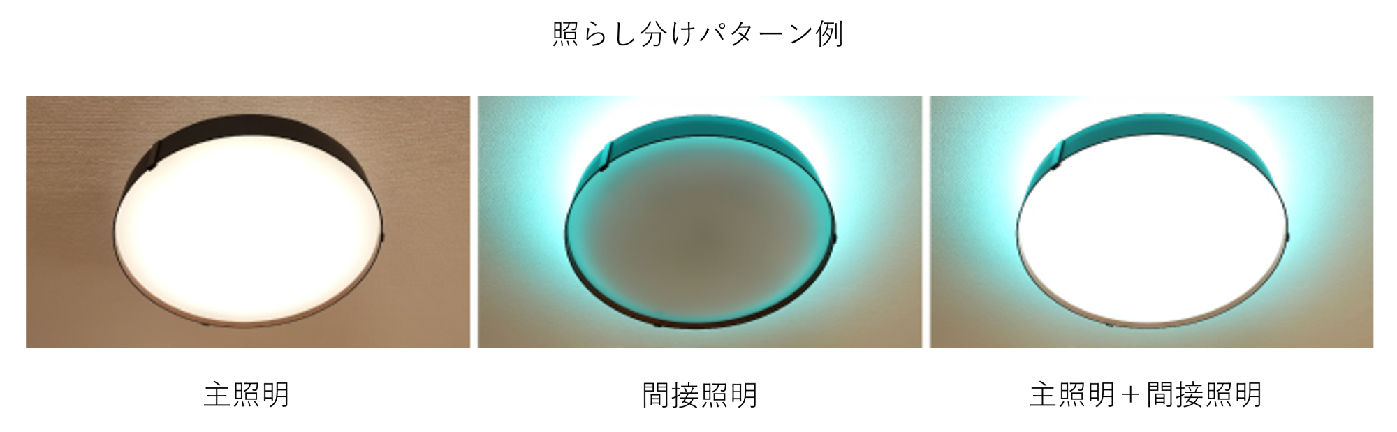 「主照明」「間接照明」「主照明+間接照明」の3つの点灯切り替えができます。「主照明」と「間接照明」のそれぞれで調光10段階、調色11段階の調整が可能で、「主照明+間接照明」を含めると12,320通りの多彩な光の演出を楽しむことができます。