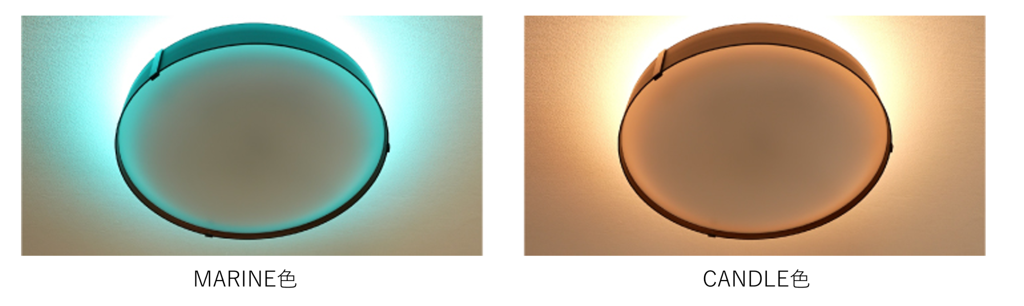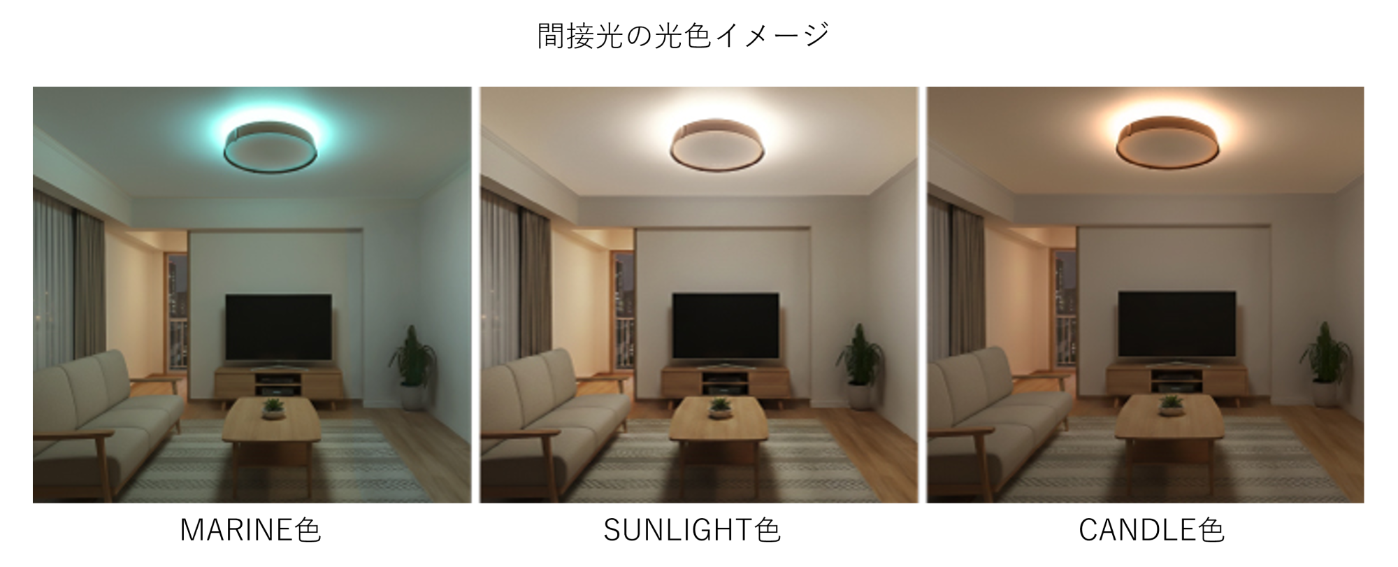 参考:間接照明の光色は、MARINE色はブルーグリーン色、CANDLE色は電球色、SUNLIGHT色はその中間色になります。